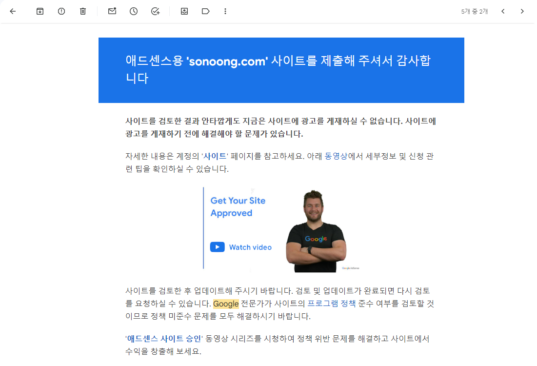"사이트를 검토한 결과 안타깝게도 지금은 사이트에 광고를 게재하실 수 없습니다. 사이트에 광고를 게재하기 전에 해결해야 할 문제가 있습니다."