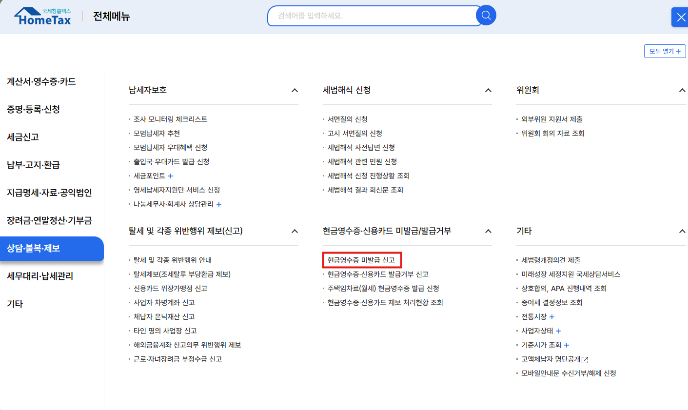 - 전체 메뉴에서 [상담.불복.제보 → 현금영수증 미발급 신고]를 선택하세요.