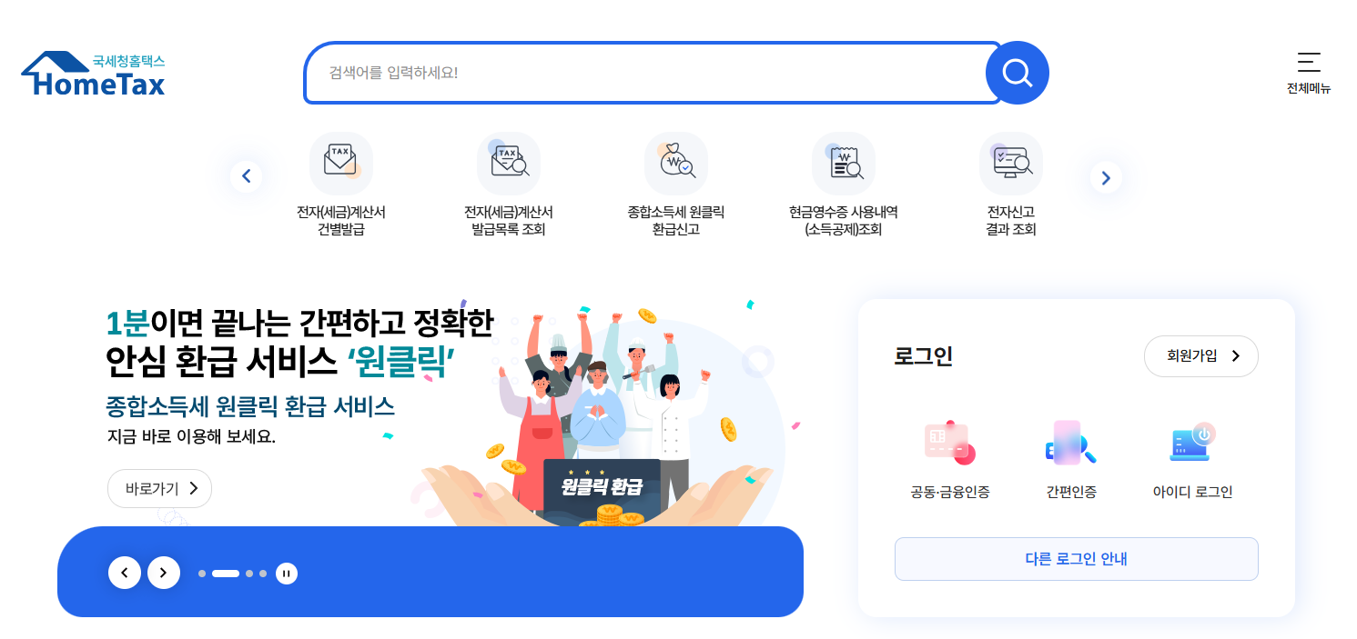 - 국세청 홈텍스(https://hometax.go.kr)홈페이지에 들어갑니다.