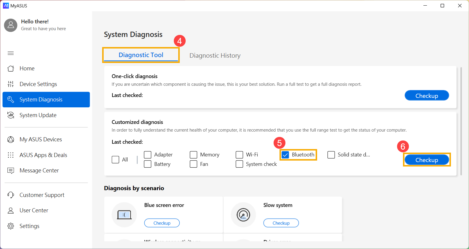 3️⃣ MyASUS로 블루투스 진단을 실행합니다.